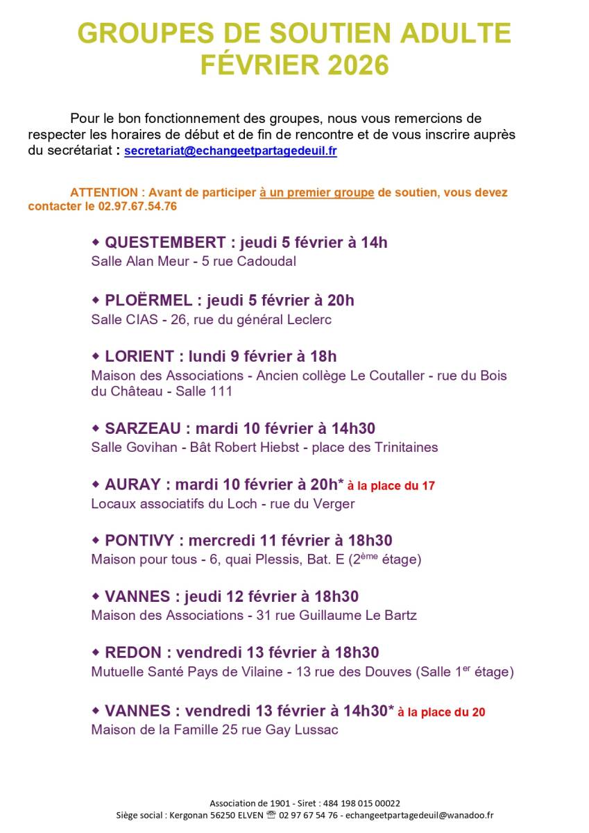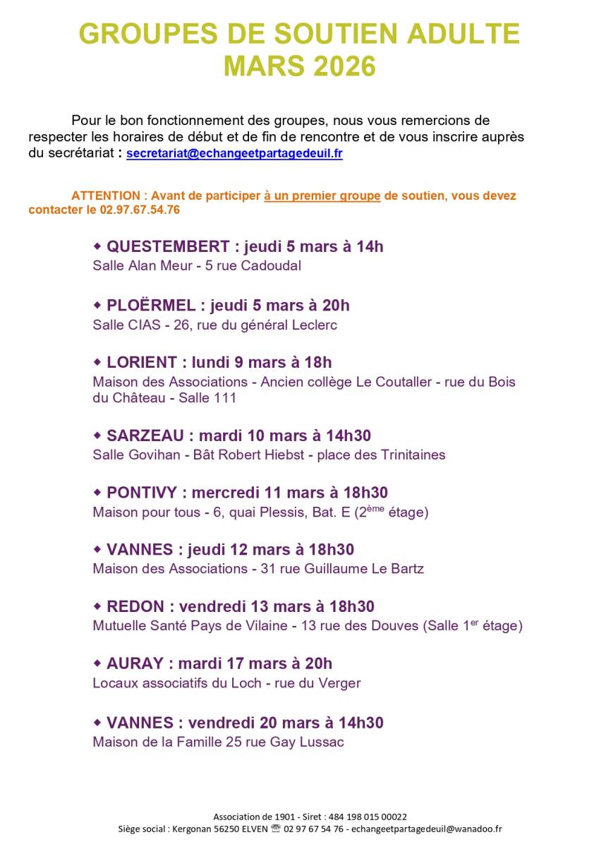 Dates des prochains groupes de soutien adultes